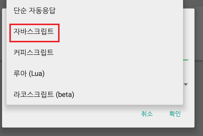 종류/언어에서는 "단순 자동응답" 이 아닌 "자바스크립트"를 선택해 주도록 합시다.